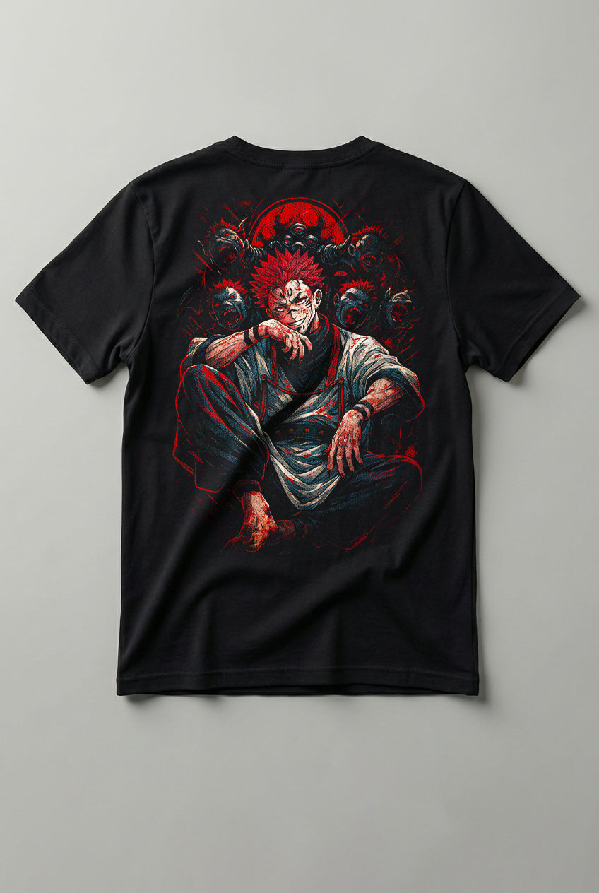 Estampa exclusiva inspirada em Sukuna, com visual sombrio, traços marcantes e presença dominante, aplicada em silk de alta definição;