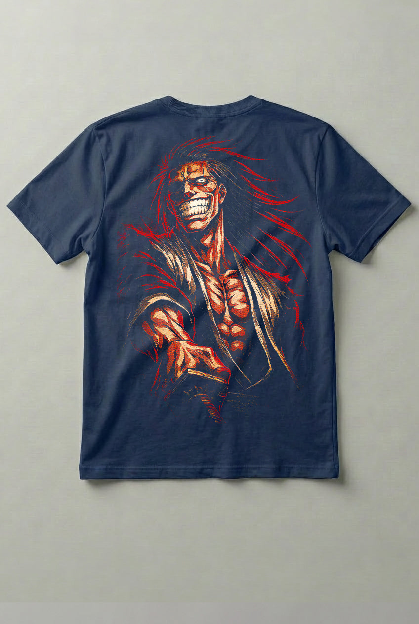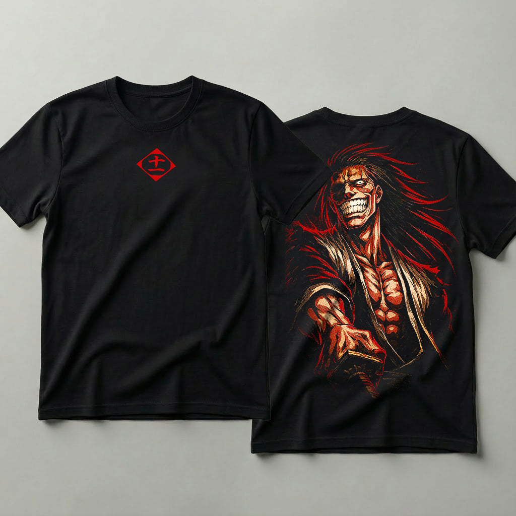 Estampa exclusiva inspirada em Zaraki, com visual brutal, traços intensos e presença dominante, aplicada em DTF de alta definição, garantindo cores fortes e excelente fixação;